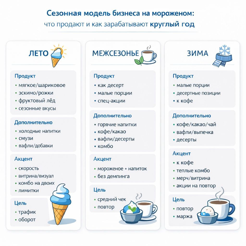 - в межсезонье не “умирать”, а удерживать средний чек и частоту продаж за счет прочего ассортимента (горячие напитки, вафли/десерты, милкшейки, смузи, комбо),