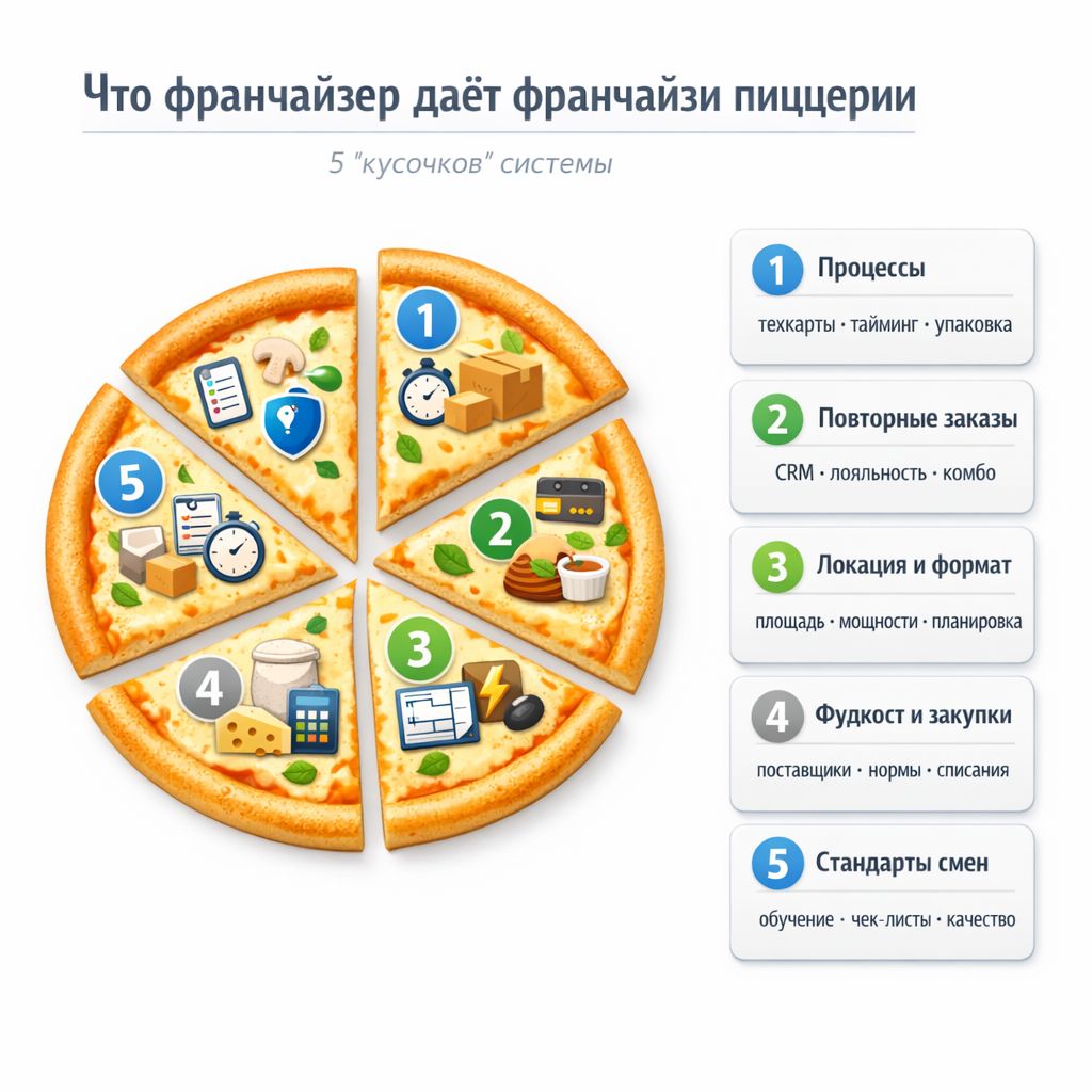 Если открывать пиццерию “с нуля”, вы фактически одновременно должны запустить производство, логистику, IT-систему, маркетинг и сервис – и всё это на рынке, где ошибки стали стоить дороже.