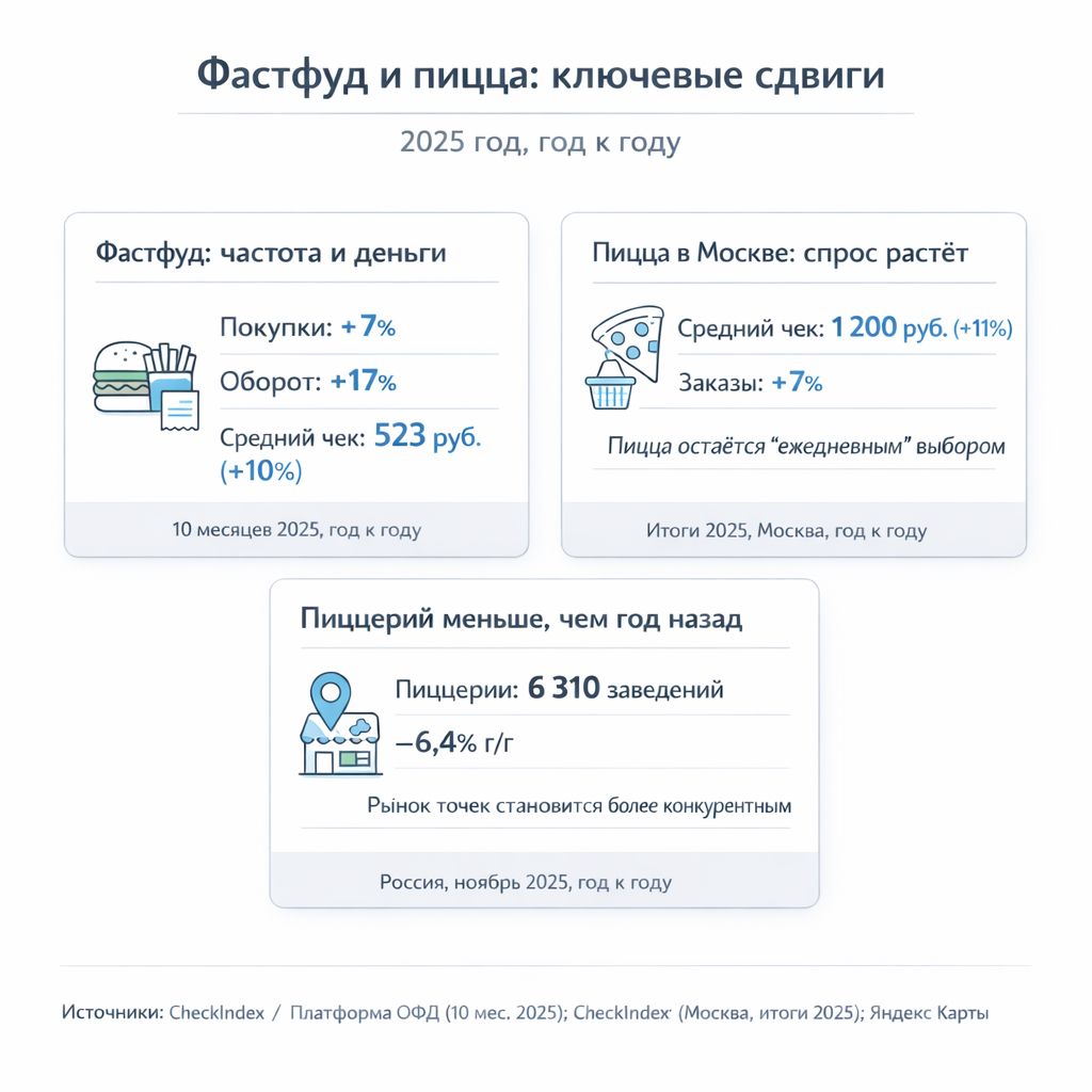 Ситуация с пиццей и пиццериями похожа на ситуацию с фастфудом. В статистике по 2025 году здесь также фигурировал рост среднего чека и количества заказов с одной стороны, при этом падение числа пиццерий с другой.