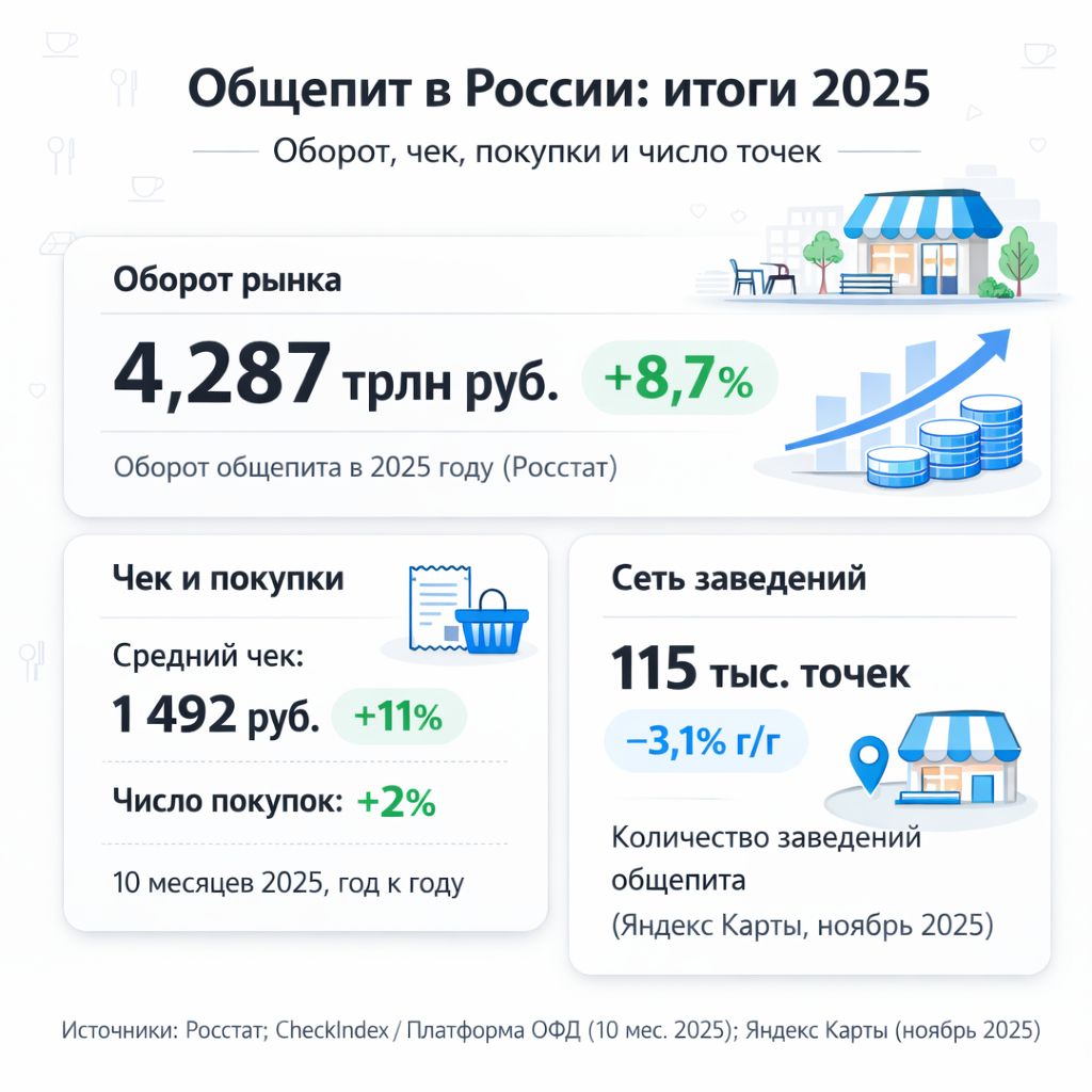 По официальной статистике Росстата, оборот общепита по итогам 2025 года составил 4,287 трлн руб. (рост +8,7% в сопоставимых ценах к 2024-му).