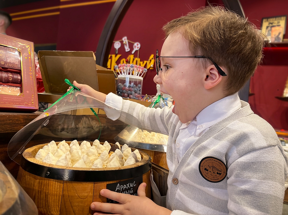 ⭐ Дополнительный источник дохода — тематические товары, которые увеличивают средний чек. Помимо сладостей, в точке представлены товары в стиле Harry Potter: палочки, кружки, шарфы, очки, фигурки, блокноты и другие позиции, которые работают как эмоциональная допродажа. Покупатель приходит за сладостями, а уходит с более крупной покупкой — за счёт подарочного сценария, импульсного выбора и вовлечённости в саму концепцию бренда.